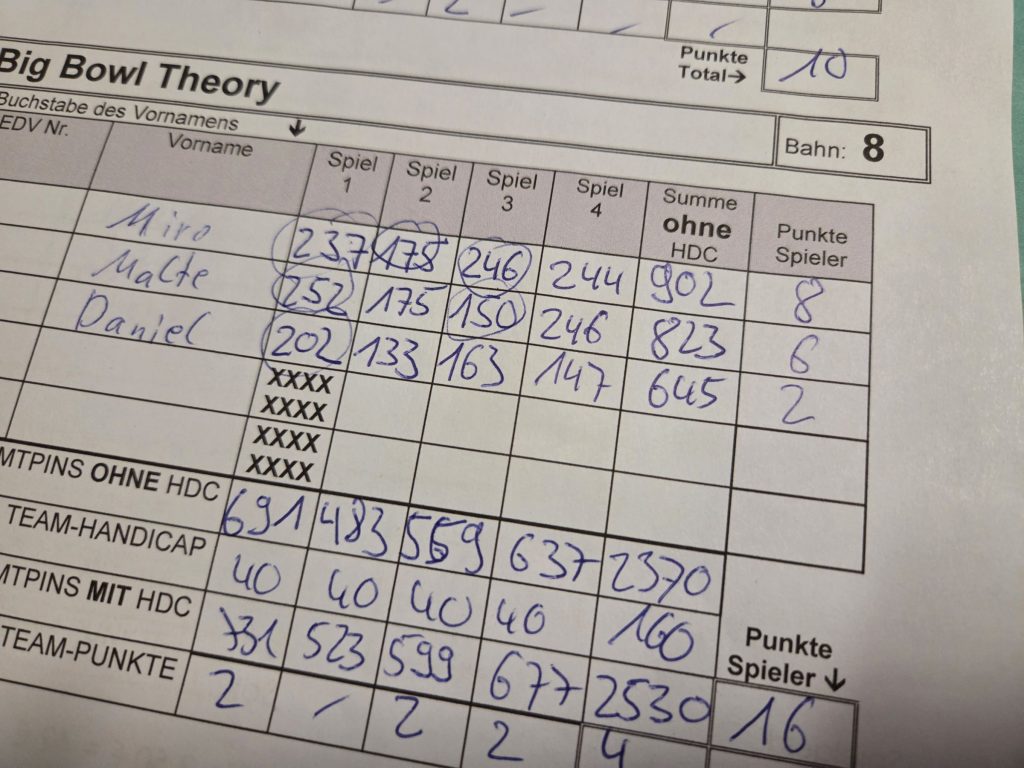 Was war denn da bei „The Big Bowl Theory“ los? Miro, Malte und Daniel haben am heutigen Spieltag ein Nettoergebnis von 2.370 Punkten abgeliefert, was einem Nettoschnitt von 197,5 entspricht. Starke Einzelergebnisse und dazu die beste Teamleistung des Abends!