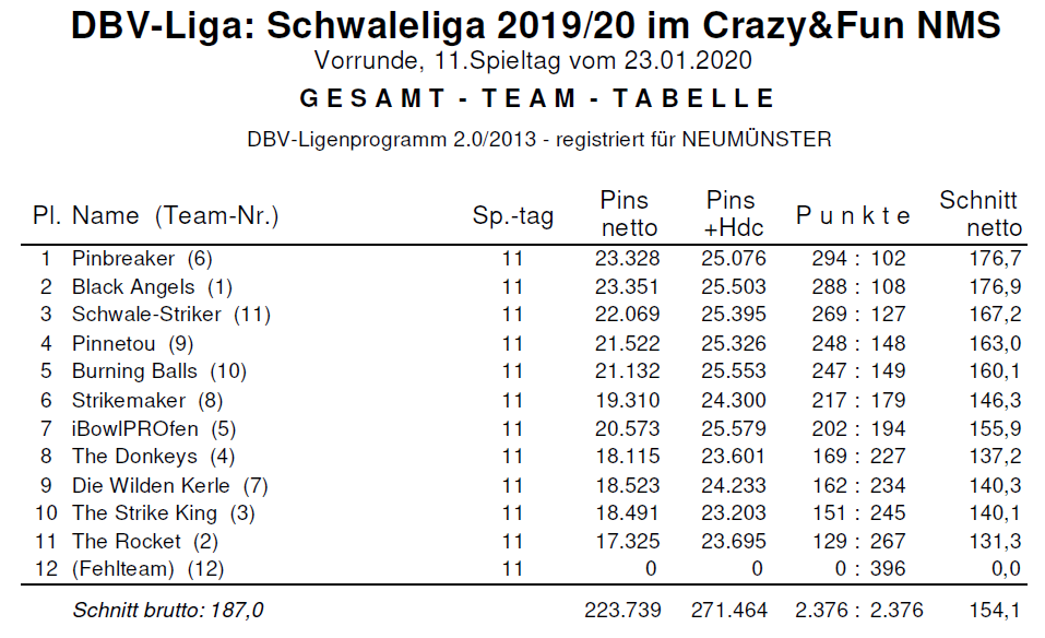 Hier kommen die Ergebnisse vom 3. Spieltag der Rückrunde. Ohne das Archiv befragt zu haben, möchte ich mal vermuten, dass die 701 Pins Nettoteamergebnis vom Team „Black Angels“ das höchste Ergebnis seit Beginn der Liga ist. Das entspricht immerhin einem Teamschnitt von 233 Holz (Netto!). Toll gemacht!