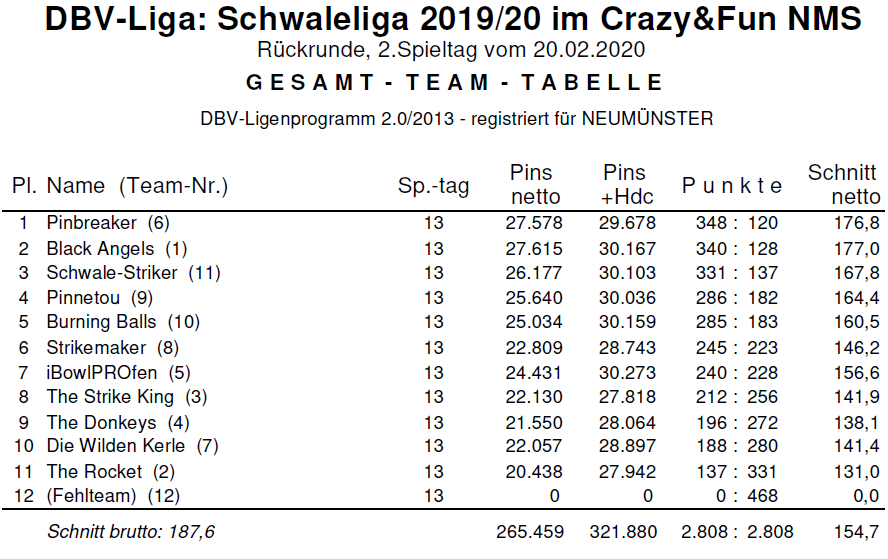 Hier sind die Ergebnisse vom ersten Spieltag der Rückrunde. Die „Pinbreaker“ sind das erste Mal vom 1. Platz gestoßen worden. Ganz knapp vorne steht aktuell das Team „Black Angels“.