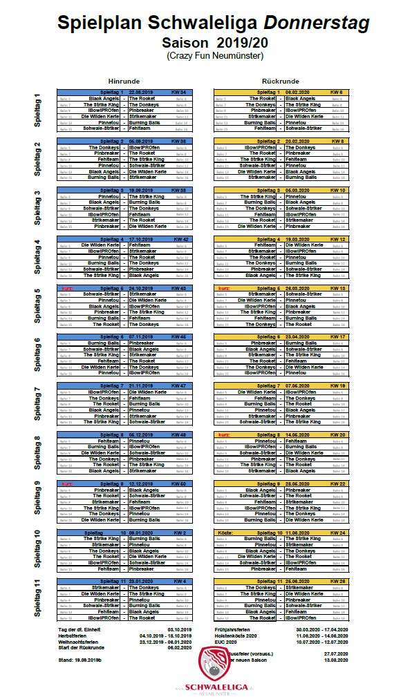 Der Spielplan für die kommende Saison in Neumünster wurde nochmal korrigiert. An den Terminen hat sich nichts geändert, der Spielschlüssel wurde nochmal neu erstellt, da ein Team fehlte. Wir spielen nun mit 11 Mannschaften, sowie einem „Fehlteam“.